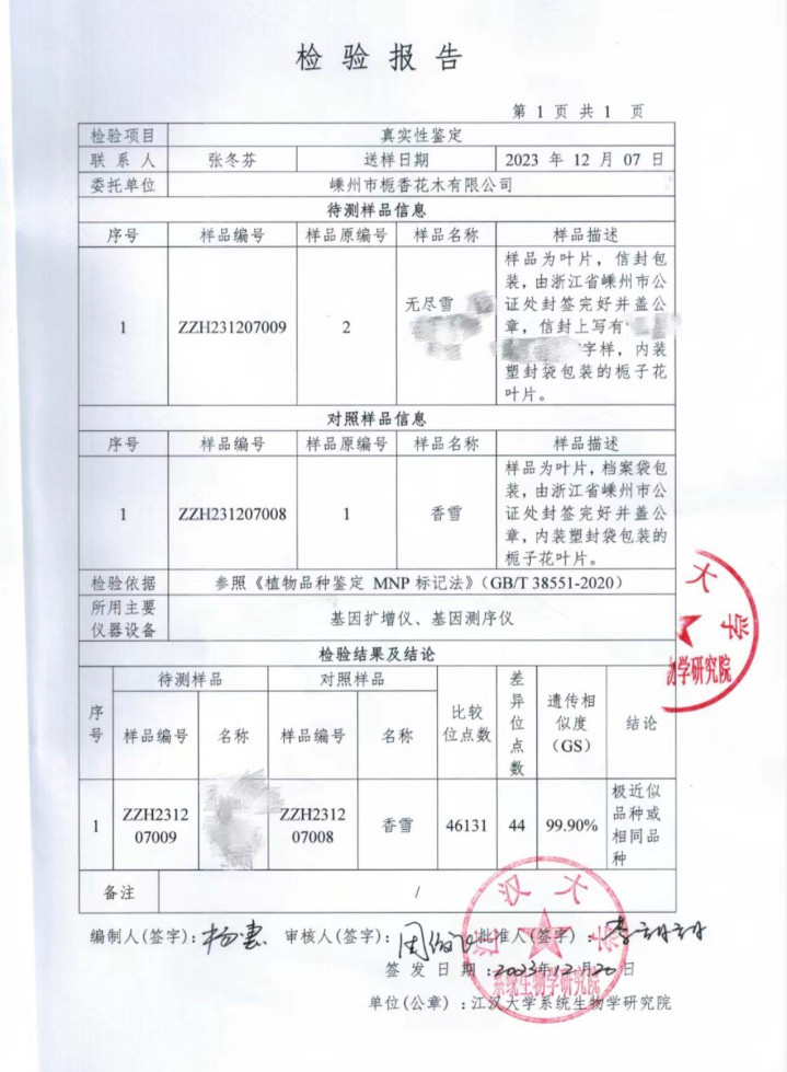 2023年11月,张军在公证东谈主员见证下,从自家研发基地取样“香雪”叶片,又在侵权平台公证购买“无限雪”样品,送往江汉大学系统生物学料到院检测。收尾裸露,两者遗传同样度达99.9%,为极类似或换取品种。