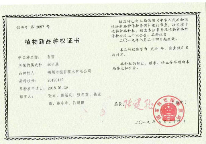 时间回到1998年,张军在嵊州崇仁镇的山野间发现了一株花期超长的栀子花母株,历经20年培育,2019年7月,“香雪”稳重赢得国度植物新品种权,成为我国首个栀子属植物新品种,还拿下北京世界园艺展览会非凡奖。手脚无性生息品种,“香雪”扦插即可繁育,且花期是正常栀子花的5倍多,商场价值极高。