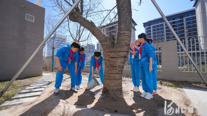 3月18日,雄安史家巷子小学,学校“看管古树志愿队”成员正在为乡愁树浇水。河北日报记者李畅摄