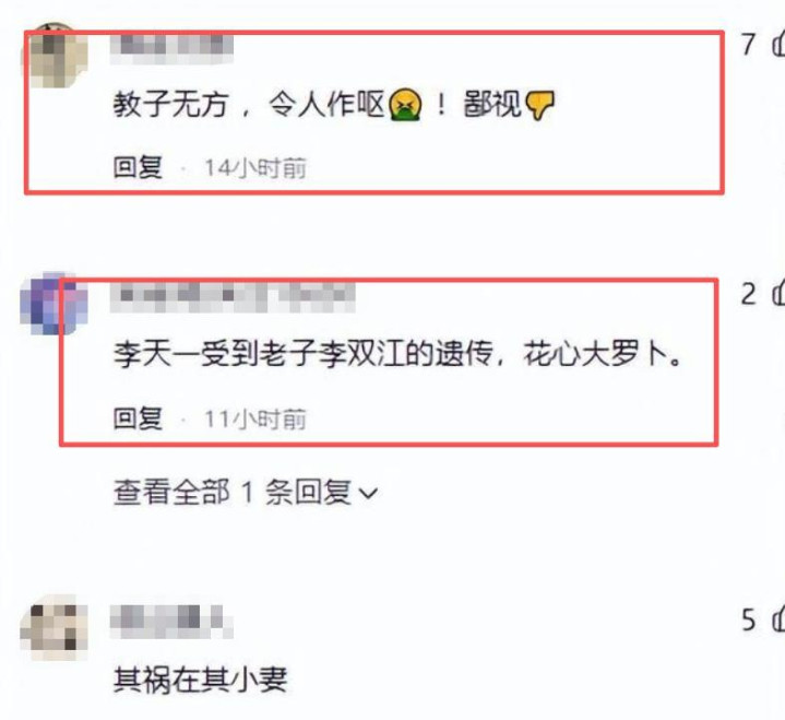 除此以外,李双江 “月入八万不够花”,也与小犬子李天一关联。