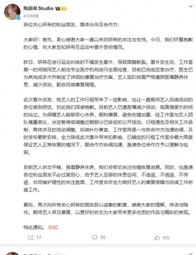 为保险艺东谈主概况省心疗养、告成康复,幸免伤情加剧,经使命室与艺东谈主团队隆重运筹帷幄,决定暂停或调遣近期部分已排定的公开活动、行程通知及关连使命录制,具体波及的活动调遣、后续补作事宜,亚搏体育app中国最新版本使命室将逐个与各和谐方交流和谐,实时发布最新安排,全力裁减这次未必带来的影响,已详情的行程使命室会最大放胆保证艺东谈主平方复原的情况下,跟和谐方和谐交流,恳请列位和谐方赐与交融与包容。