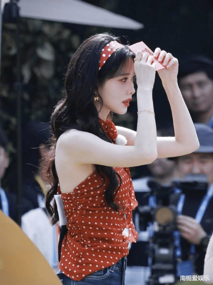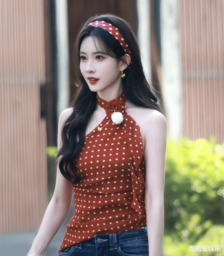 路透镜头捕捉到,孟子义身着一件红色波点挂脖上衣,搭配深色高腰牛仔裤,举座造型既保留了90年代的摩登感,又不欠妥代前锋的干练。她头戴同色系发带,一头蓬松的大海潮鬈发纯粹披垂在肩头,与炎火红唇短长分明。这种“明艳大女主”的设定,让她在东谈主群中显得颠倒珍视。更道理的是,据现场责任主谈主员闪现,孟子义在本期节目中的变装设定恰是“总司理”,这孤苦飒爽干练的装束,仿佛让她平直穿越进了年代剧的片场,轻而易举间尽显气场。