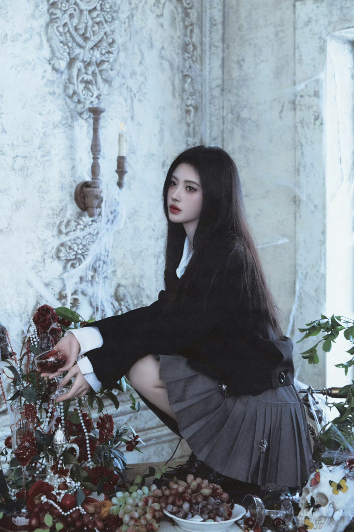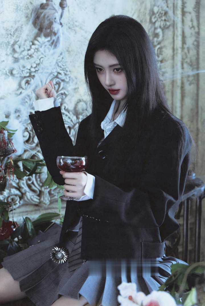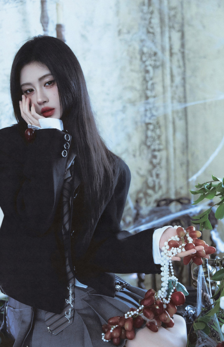 身穿玄色西装外衣内搭白衬衫,化身暗黑系巨室令嫒,轻而易举间满是生东说念主勿近的矜贵。周围满桌的珍珠、生果与红酒交汇,相持雕花配景衬得她眉眼愈发冷冽。