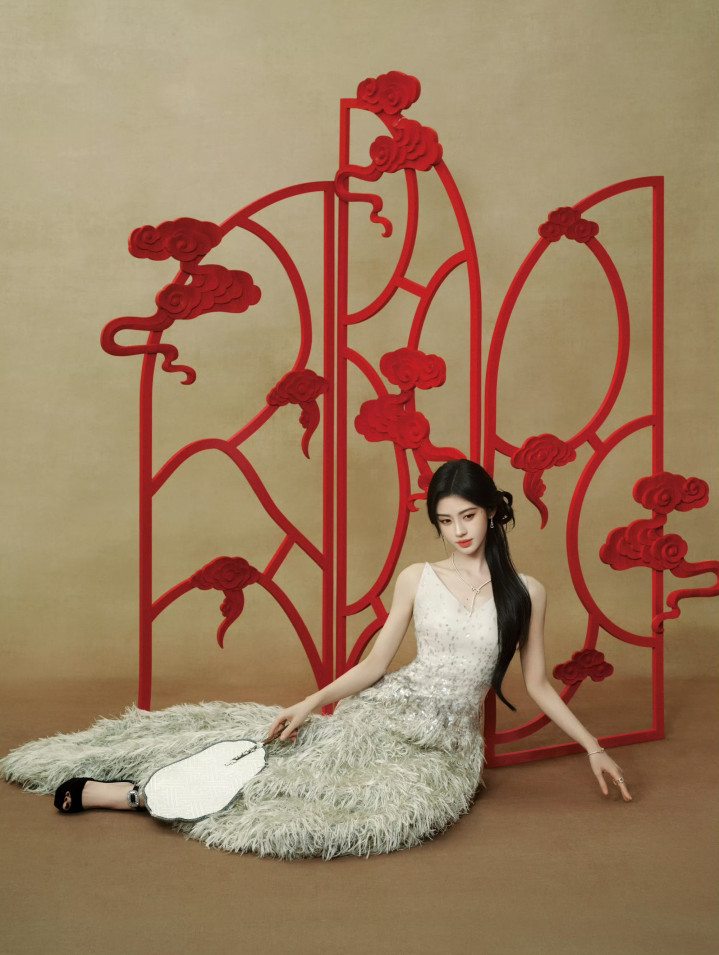 鞠婧祎一袭白纱羽毛长裙伫立红云雕花前,诠释着阴寒恶女的极致氛围感。裙身细吊带衬出畅通肩颈线条,层叠的羽毛材质自带流光,与细钻耳环、珍珠项链交相衬映。