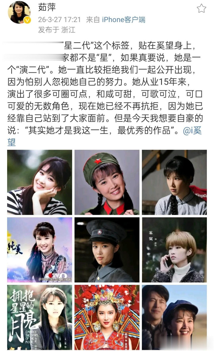 茹萍前几日还在酬酢平台为女儿话语,她连晒18张女儿剧照,对女儿奚望言语尽是爱与夸耀,并示意女儿才是她这一世最优秀的作品,如斯低调的佳耦培养出两个相似低调优秀的儿女,祝愿他们一家!