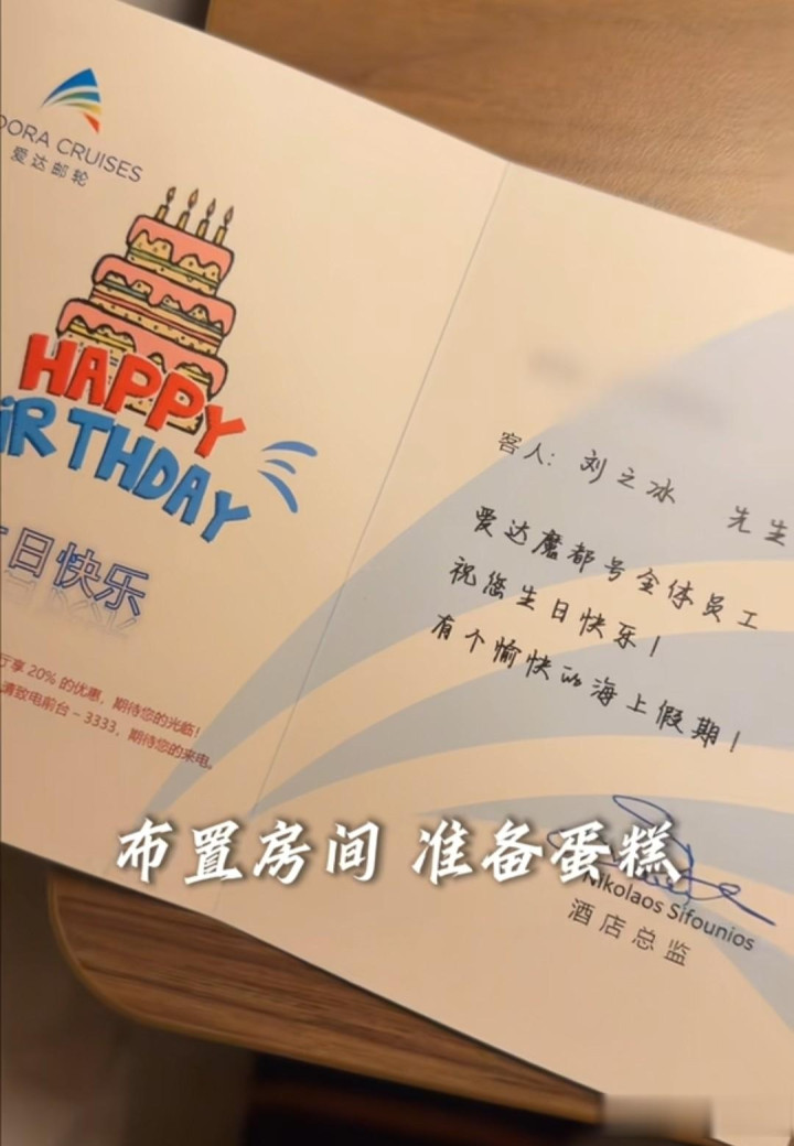今日的刘之冰打扮的前锋潮水,一稔深蓝色卫衣,外搭一个玄色炫酷外衣,下身配牛仔裤,头上戴着一个红色鸭舌帽,显得很喜庆。他方位的邮轮是爱达魔邮轮,责任主说念主员为把他住的总计这个词房间遮掩的寿辰氛围感拉满,刘之冰看到后高出兴奋,连着拍了好几张相片。