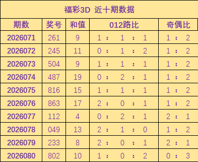 开奖纪念:福彩3D上期奖号为802,其中奖号012路比为1:0:2,和值为10,奇偶比0:3。