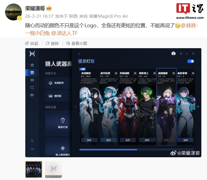 IT之家3月31日音讯,荣耀末端股份有限公司全场景居品线慎重东说念主@荣耀潇哥当天首曝荣耀WIN游戏本的“猎东说念主火器库”,展示了其部分功能,包括高刷快捷开关、触控板开关、猎杀灯效、猎东说念主静音散热等。
