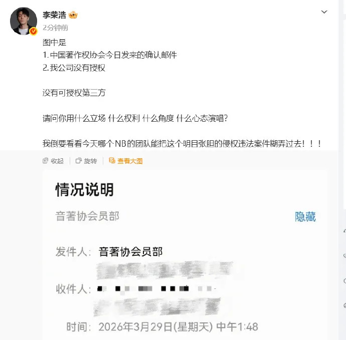 这个复兴昭彰让李荣浩起火。李荣浩再次在微博发声,并放出中国文章权协会发来的“情况评释”截图,图片中,中国音乐文章权协会明确提到,“协会未就该作品(《李白》)披发任何授权。”
