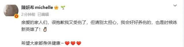 随后陈妍希发文:亲爱的家东谈主们,很对不起我又受伤了,但请别太挂念,我会好好养伤的,亚搏app最新版本亦然时候练新英豪了!但愿大家齐体格健康~
