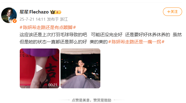 有网友发视频称,旧年陈妍希就疑似因打羽毛球导致脚受伤,“步碾儿一瘸一拐”。
