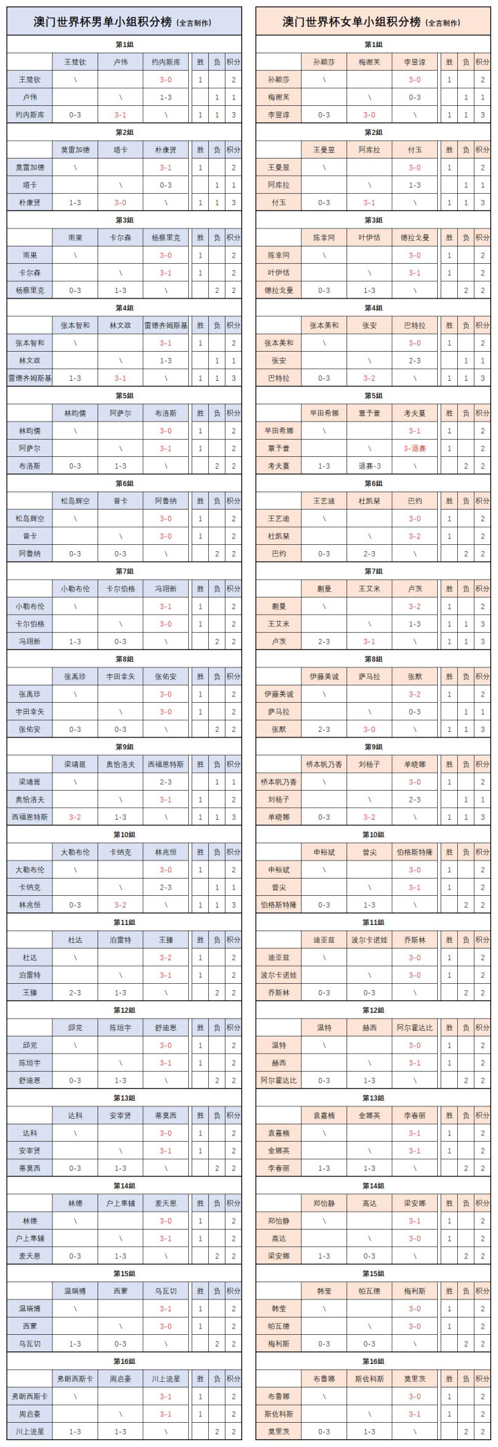 至于梁靖崑景象欠安在首轮爆冷不敌阿根廷通顺员西福恩特斯,接下来仍有一线期许小组出线,但必须以较大上风击败德国宇宙冠军奥恰洛夫才行(3-0或3-1);至于外协会照旧有十一男、十女连输两场,注定不可能晋级第二阶段淘汰赛,最新积分榜如下: