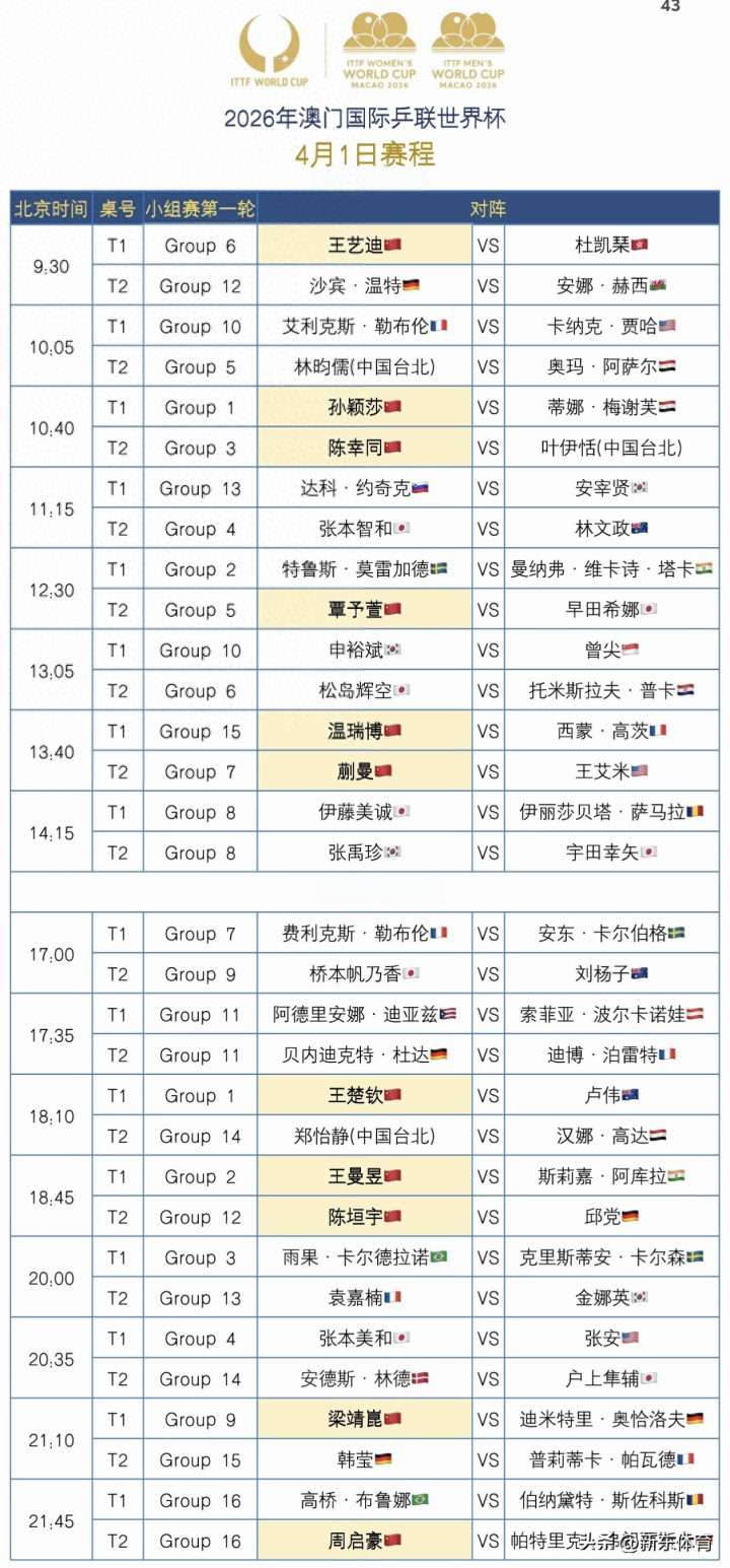 北京时刻4月1日,2026年澳门国外乒联单打寰宇杯迎来小组赛收官日。国乒11名选手将一皆登场,为16强席位张开终末一战,其中男单梁靖崑、陈垣宇、温瑞博、周启豪四东谈主均将迎战欧洲强敌,出线地方严峻。女片面,覃予萱与日真名将早田希娜的径直对话将决定小组头名包摄。