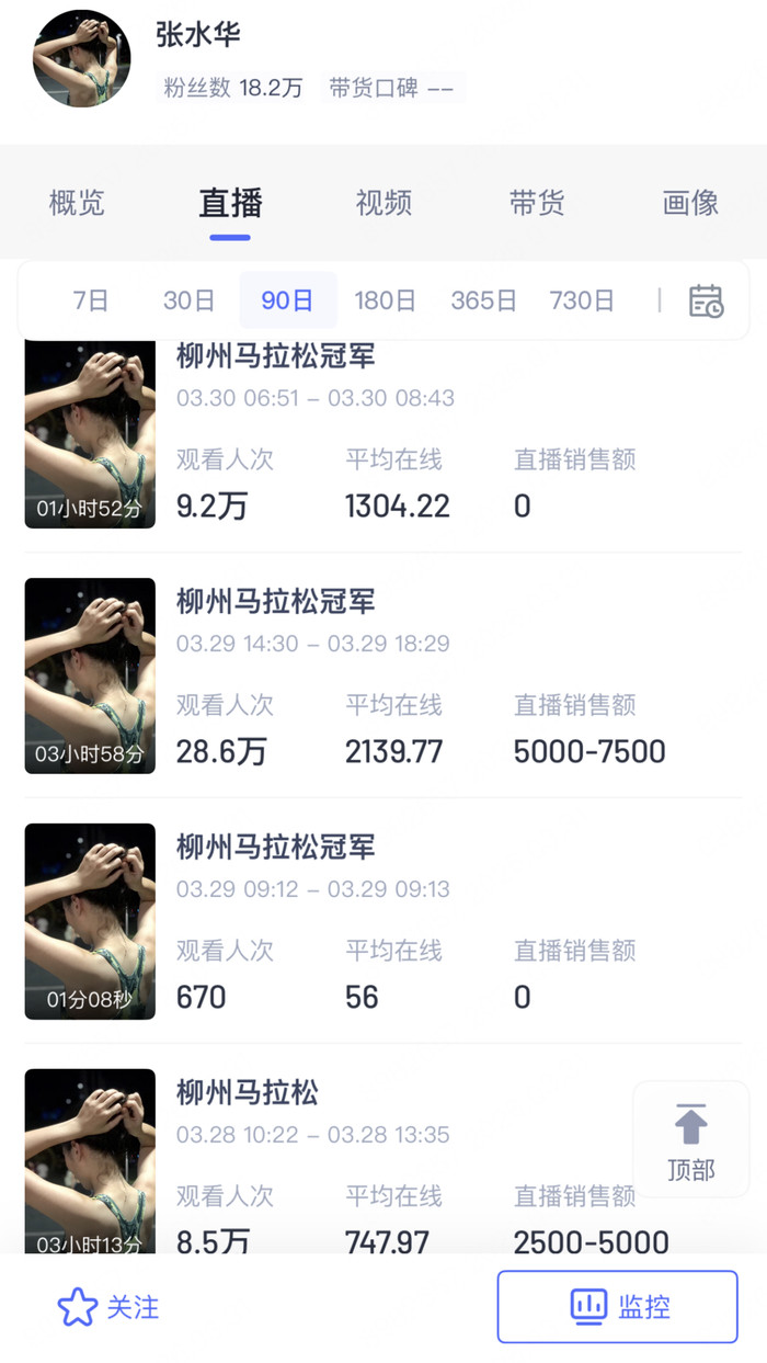 数据监控平台炫夸,张水华共直播34次,其中1月8日的第二次直播不雅看东谈主次接近50万,平均不雅看东谈主数约13万。柳州马拉松夺冠后的直播,迷惑了近30万东谈主次不雅看,是其直播东谈主数第二高的一次。张水华的账号粉丝曾经经从年头的9万多涨到了如今的18万多,数目翻倍。