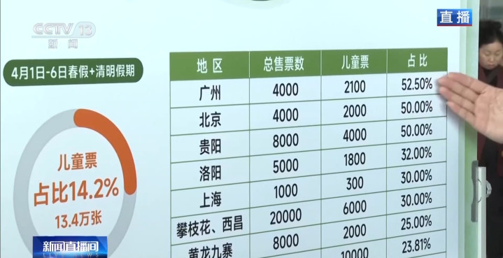 4月1日从成皆始发的列车,到广州和北京的列车分辨有4000个座次的铁路车票,儿童票的占比分辨达到了52.5%和50%,铁路出行也成了好多家长春假出行共同的收受。