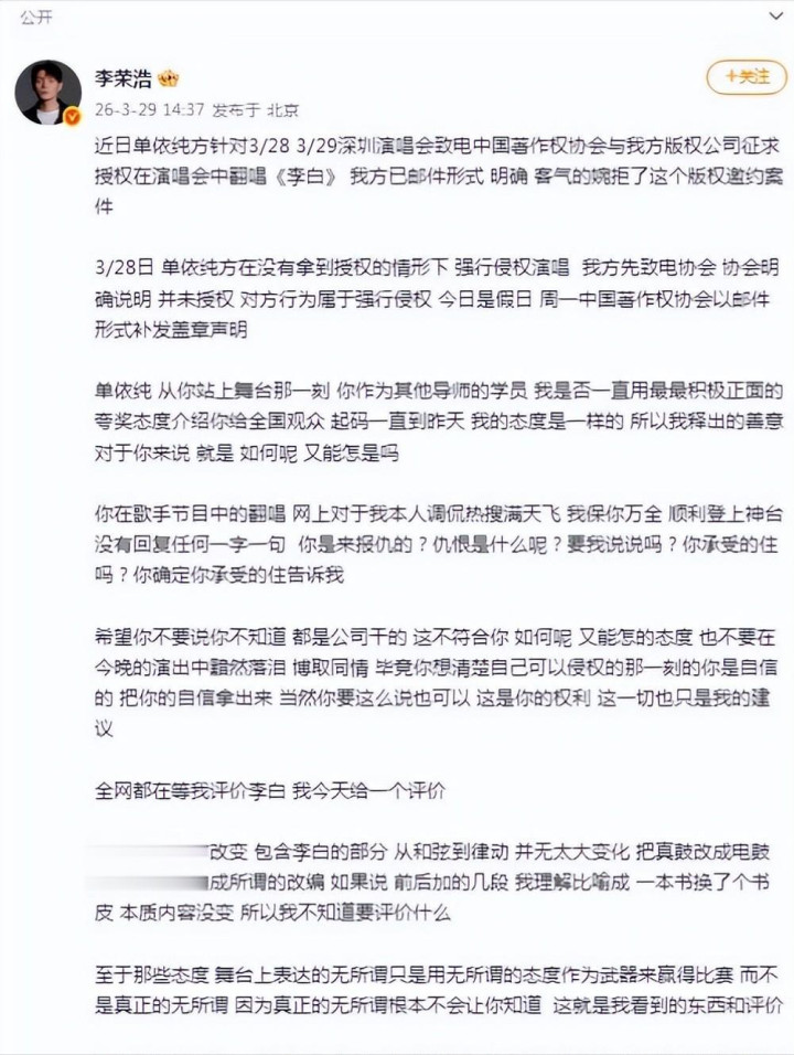 3月29日,李荣浩荒凉在个东说念主酬酢媒体上发文,口吻订立地控诉单依纯侵权翻唱我方的歌曲《李白》,以至不吝亲身下场,莫得让使命室代为回答,足以看出他的大怒。