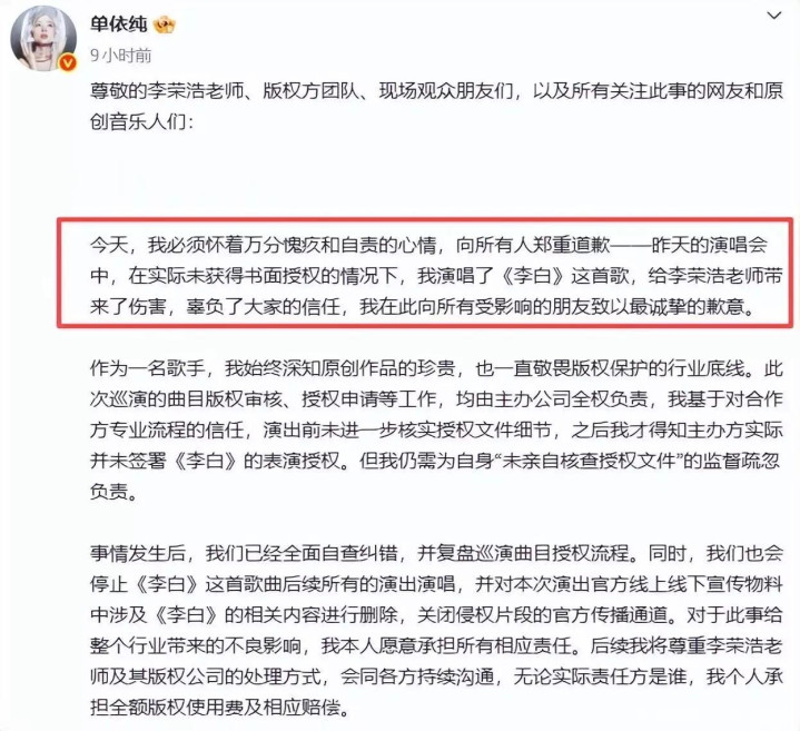 事件发酵后,单依纯第一时代出头说念歉,可说念歉的中枢却是“甩锅”,宣称我方不知说念侵权事宜,把通盘包袱皆推给了公司。