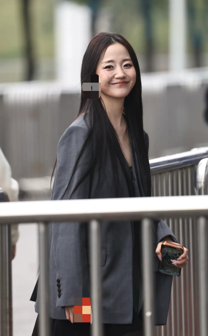 万千惠灰色西装外衣搭配玄色纱裙,一头黑长直发型,眼妆有点失败,眼角那处看起来白白的,显得不爱干净。