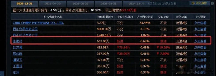 A股阿谁堪称“廉价股捕手”的超等牛散——张素芬,她又首先了。 况兼此次动作不小,径直砸重金新进了一家公司的前十大推动,持股651万股,位列第四大流畅推动。