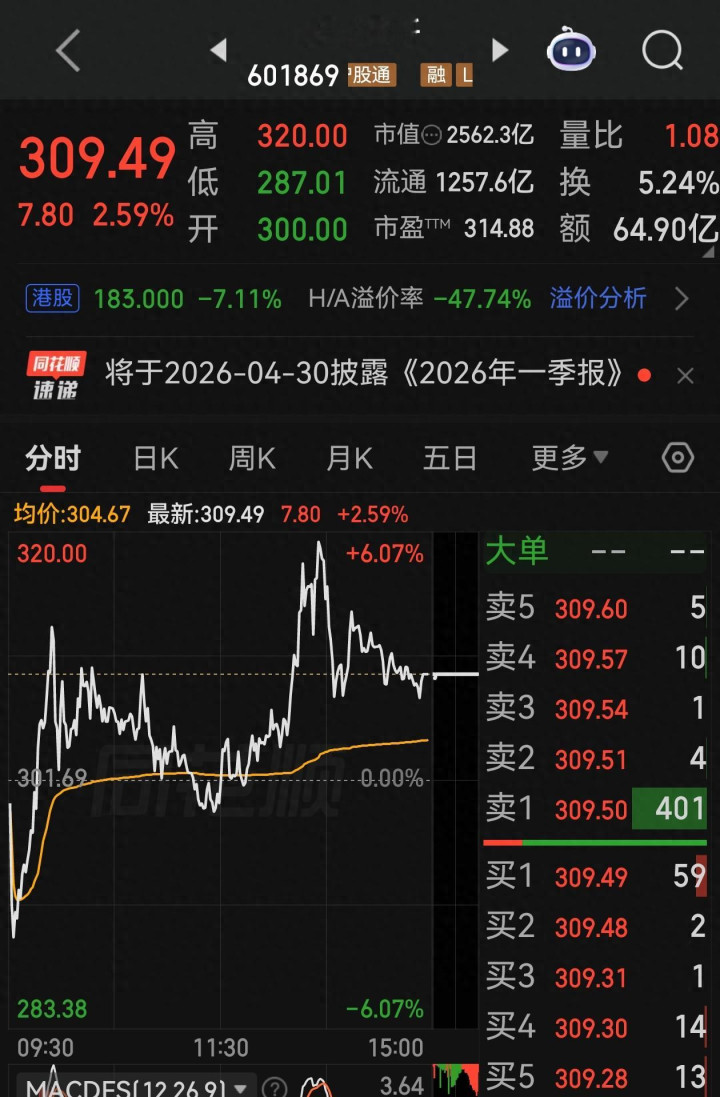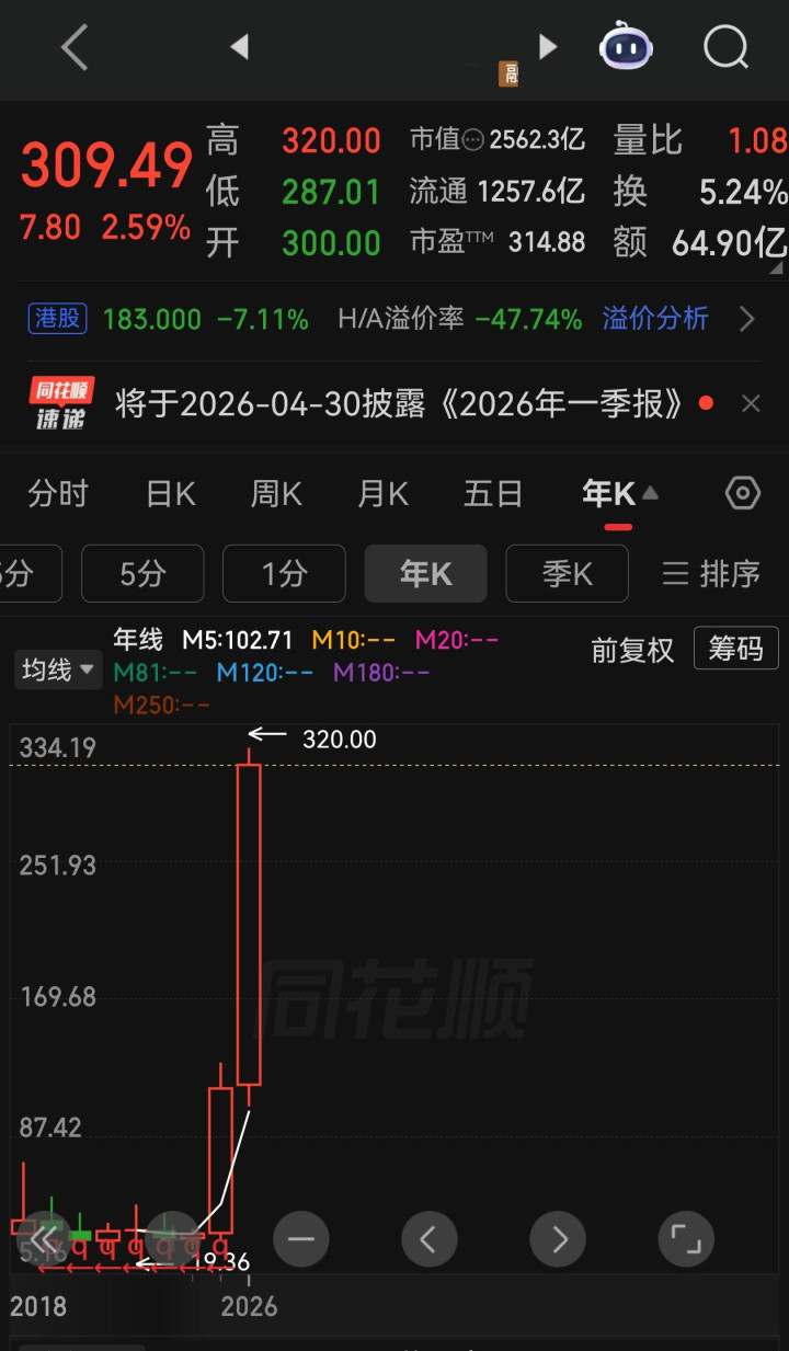 先看最直不雅的股价,2025年4月初才33块多,到2026年3月底还是309块,当天盘中最高320元。一年涨了8倍多,接近10倍,最近更是6天3板,天天成交额四五十亿,主力资金连系净流入,完全是资金抱团的中枢宗旨。这波上升不是炒主见瞎炒,是实打实的行业回转、技巧打破、功绩爆发三重共振,每一步都踩在了商场的风口上。
