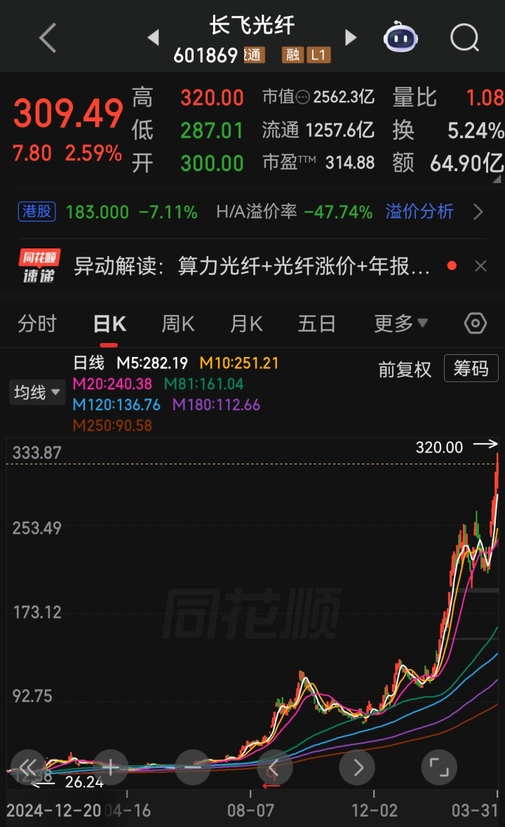最近A股有个票太猛了,长飞光纤,一年时辰从30多块涨到300多块,悄无声气翻了快10倍,市值干到2500多亿,东说念主气径直冲到A股前四十。许多东说念主烦嚣,不等于个作念光纤的老企业吗,怎样俄顷成了超等大牛股?今天咱们把它的利好、主见、中枢上风、财务、资金逻辑全讲透!