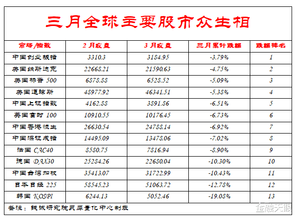 把各人主要股指的三月跌幅排个序,谜底一目了然。