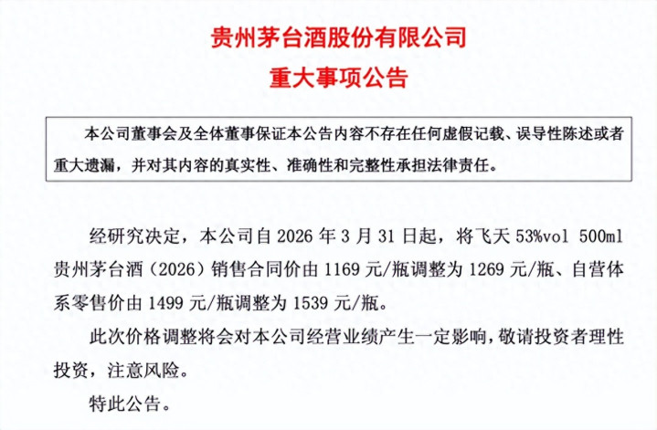 昨晚,贵州茅台一纸公告:53度飞天茅台的出厂价从1169元涨到1269元,涨了100元;但提出零卖价只从1499元涨到1539元,涨了40元。