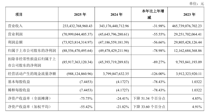 3月31日晚间,万科表示了2025年年度论述。财报骄矜,公司全年营业收入2334.3亿元,同比下滑32.0%;归母净利润-885.6亿元,弃世额同比扩大78.98%;契约销售金额1340.6亿元,同比下跌45.5%;全年完成超11.7万套房屋的委派职责。