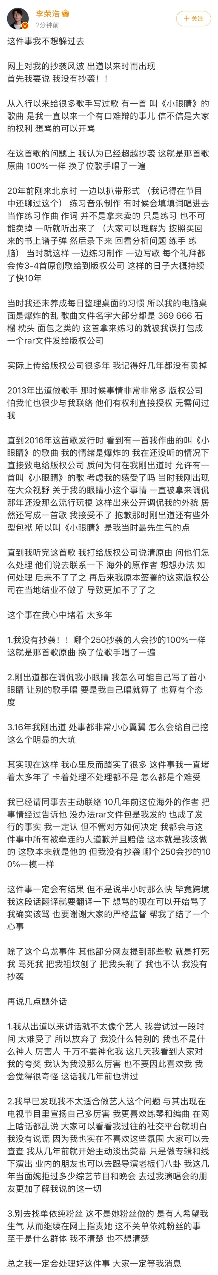 4月1日,李荣浩发文回话抄袭风云,“网上对我的抄袭风云,出谈以来时而出现,领先我要说,亚搏体育app我莫得抄袭。”全文如下: