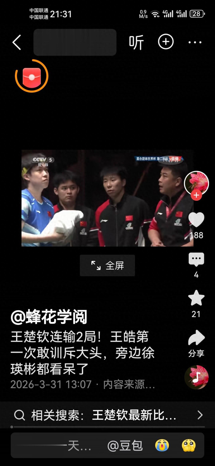 谁能思到?阿谁赛场上霸气侧漏的“大头”,竟然会被连扳两局逼到绝境。更让东谈主不测的是,执教多年的王皓,竟第一次对他自大如斯严厉的激情。要知谈,王皓对王楚钦向来是耐烦指引,哪怕输球也多是饱读舞。可此次,他是竟然急了——连输两局的背后,不是本领不成,而是心态澈底崩了!