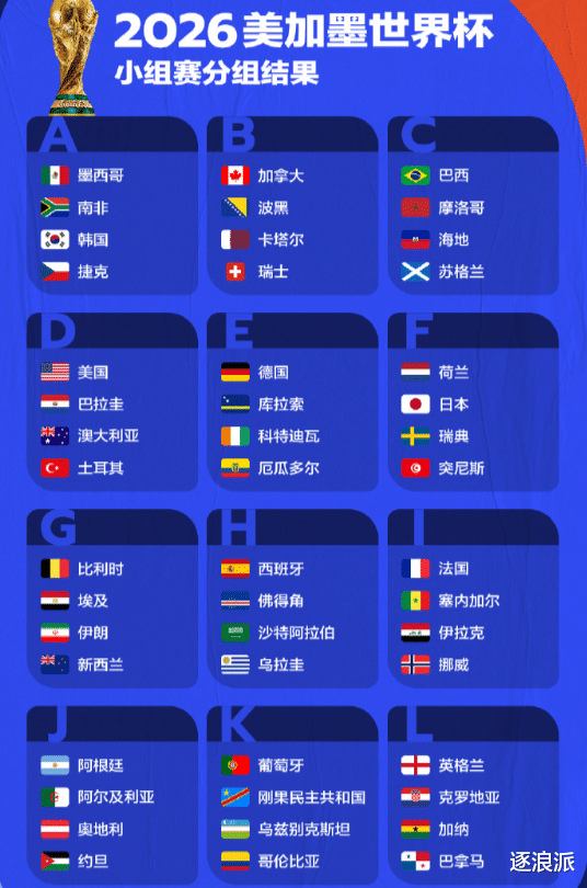至此,2026年好意思加墨全国杯64个席位一皆产生,区别是A组的墨西哥、韩国、南非、捷克;B组的加拿大、瑞士、卡塔尔、波黑;C组的巴西、摩洛哥、苏格兰、海地;D组的好意思国、澳大利亚、巴拉圭、土耳其;E组的德国、厄瓜多尔、科特迪瓦、库拉索;F组的荷兰、日本、突尼斯、瑞典;G组的比利时、伊朗、埃及、新西兰;H组的西班牙、乌拉圭、沙特、佛得角;I组的法国、塞内加尔、挪威、伊拉克;J组的阿根廷、奥地利、阿尔及利亚、约旦;K组的葡萄牙、哥伦比亚、乌兹别克斯坦、刚果;L组的英格兰、克罗地亚、巴拿马、加拿。