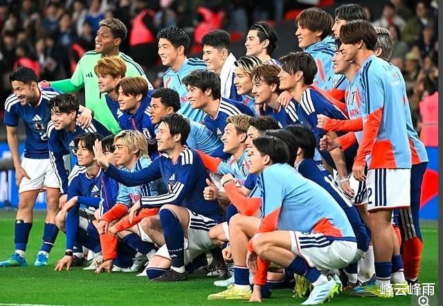 第四次交手中初次打败英格兰。面带笑貌合影眷恋的日本队球员们
