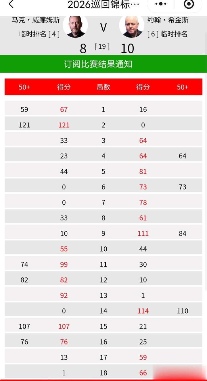 斯诺克巡回锦标赛12强赛,临了一场75二杰对话刚刚闭幕,效果有着巫师之称,且职业生计拿下33个排行赛冠军的巫师希金斯,在与有着世上最准男东说念主之称的金左手马克-威廉姆斯对决中,笑到临了,一样以10:8惊恐胜出,总之强人恒强。