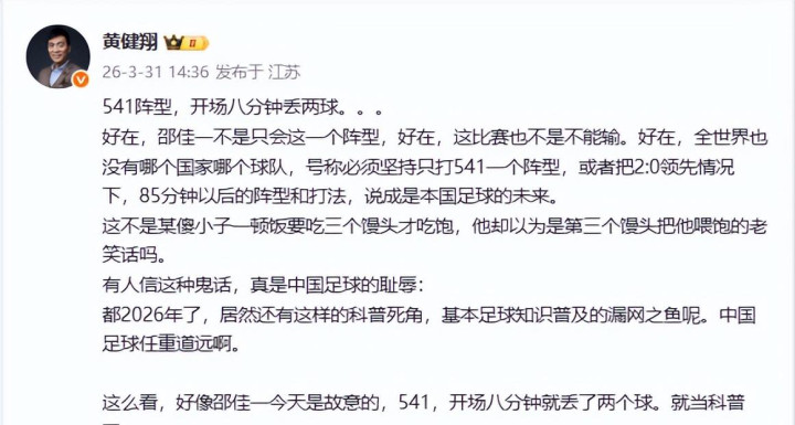 黄健翔:叱咤国足声势,点明邵佳一是成心的。